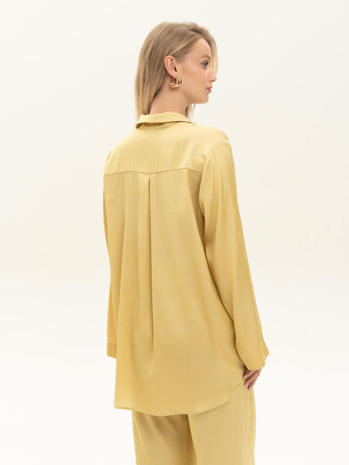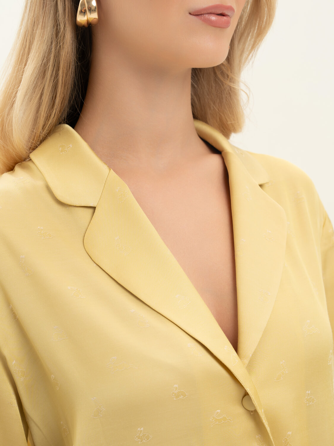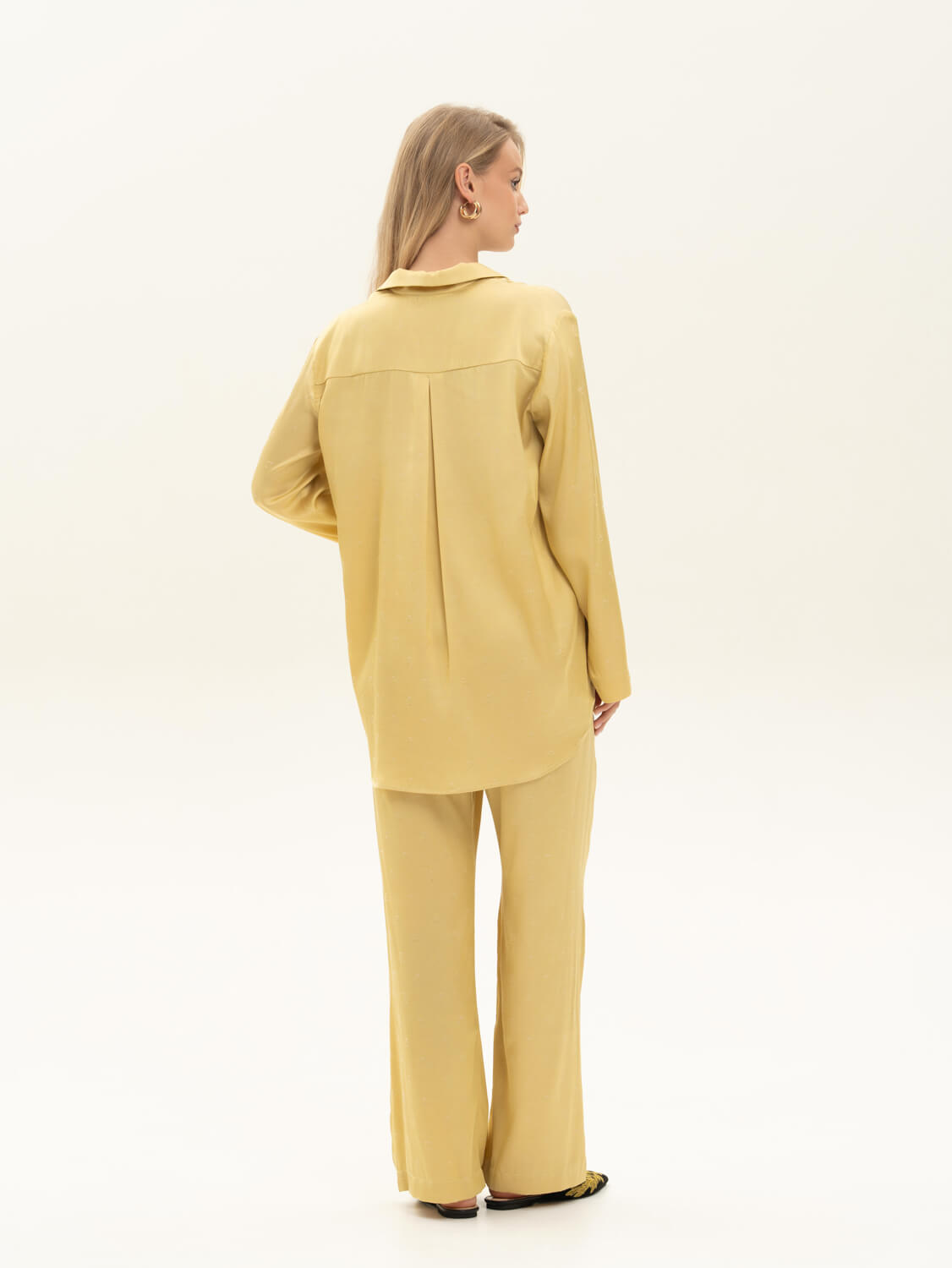 Комплект из жаккардовой вискозы с мелким принтом "Зайки'' на теплом оттенке ванили . Ткань имеет удивительную нежную нестандартную фактуру. Невероятно струящаяся вискоза с благородным переливом, которая не электризуется . Легкая, хорошо драпируется, дышит. Рубашка свободного кроя на пуговицах обтянутых тканью. Брюки прямого кроя с поясом и комфортной резинкой. Сделано в России. Параметры модели: рост 175, 88-60-90