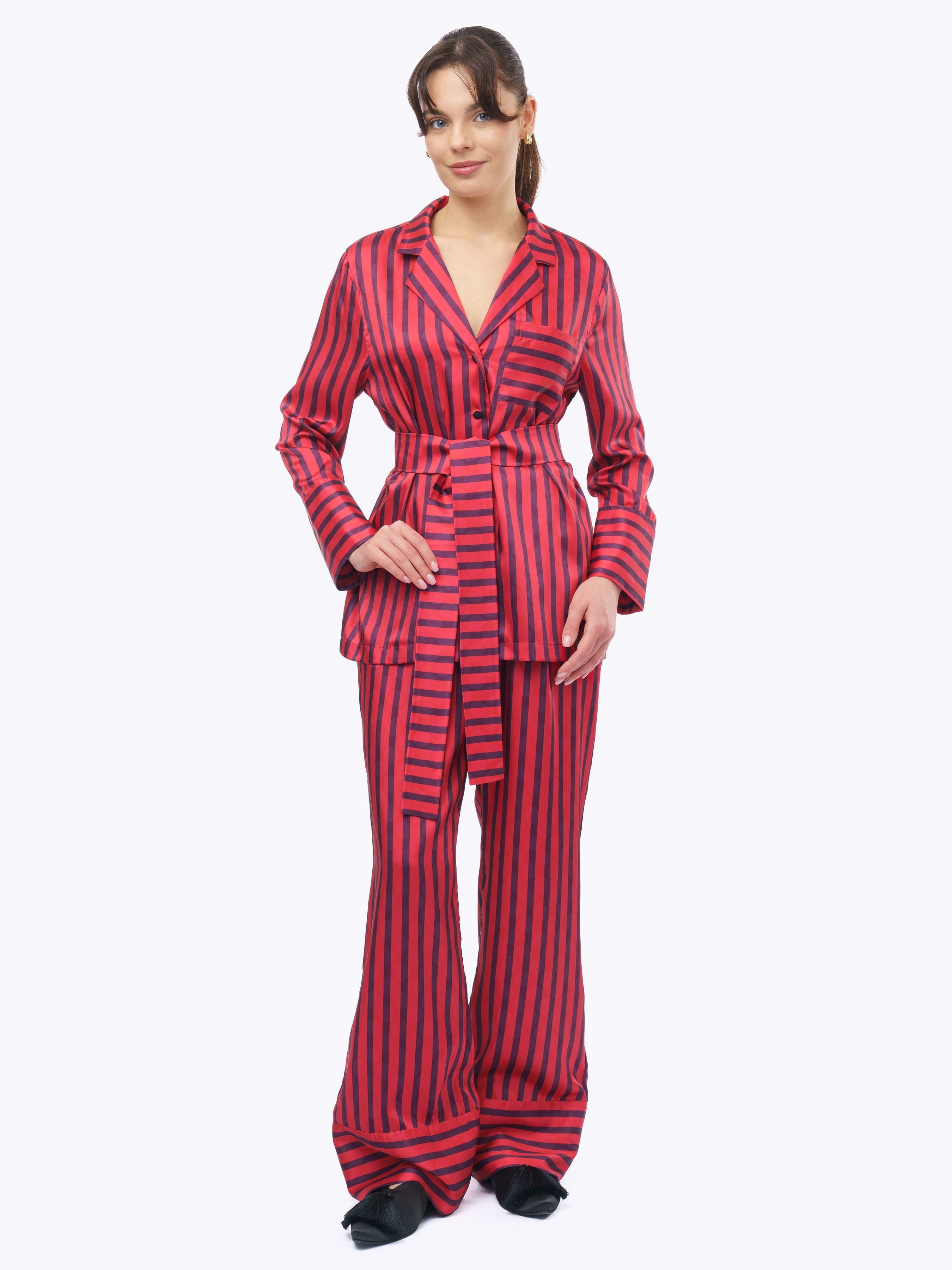 Комплект с винтажным принтом в полоску выполнен в свободном крое, обеспечивая свободу движений , а закрытые внутренние швы дарят нежность прикосновений ткани к коже.