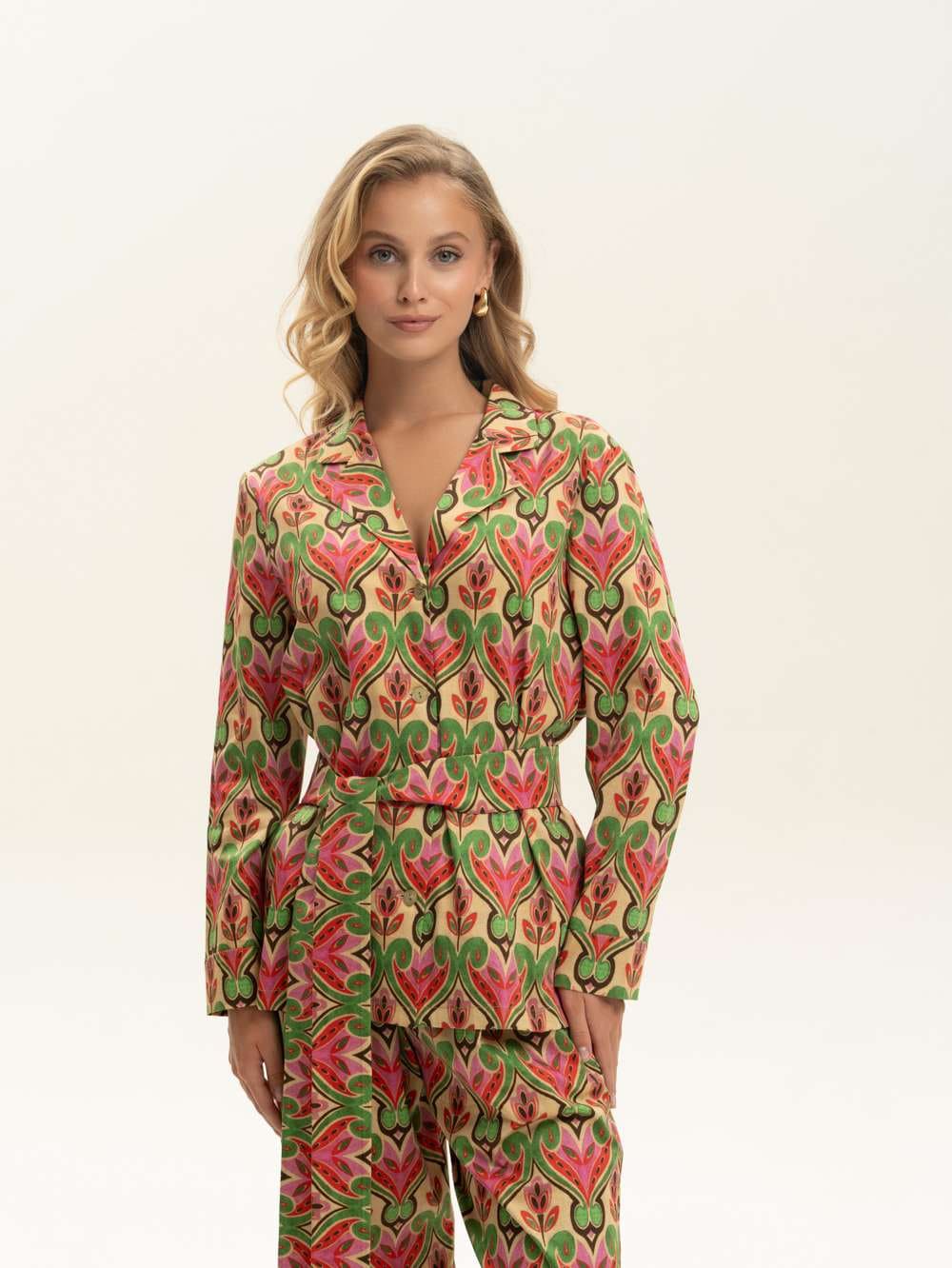 Костюм в пижамном стиле из итальянского рубашечного хлопка с изысканным принтом. Выполнен в прямом классическом крое. Свободные брюки на эластичной резнике с карманами. Рубашка-жакет без манжет и канта. Ткань отлично держит форму. Сделано в Росии. Параметры модели: рост 175, 88-60-90
