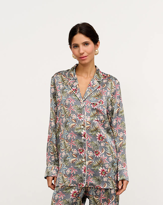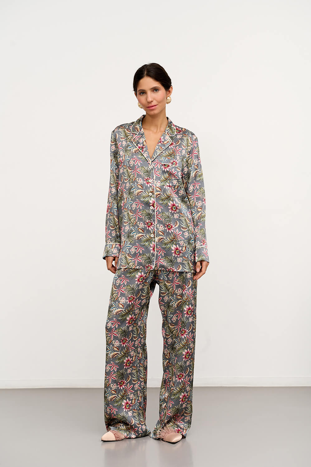Пижамный комплект из премиальной коллекции Pijama Story Exclusive с цветочным принтом. Рубашка свободного кроя с пуговицами с кантом светло-молочного оттенка по борту и на манжетах. Брюки свободного кроя: спереди пояс, сзади резинка для комфорта движений не только дома, а и на отдыхе или вечеринке. Пижама выполнена с полностью закрытыми швами с изнаночной стороны ювелирным люксовым шитьем. Шелк Mulberry- ценнейший вид шелка, сотканный из тончайших нитей тутового шелкопряда. Обладает прочным плетением и гипоаллергенными свойствами. ШЕЛК - это ткань, которая заявляет о себе. Он красивый, элегантный и роскошный, невероятно мягкий и чувственный. Сделано в России. Параметры модели: 85/63/94. Рост 176 см.