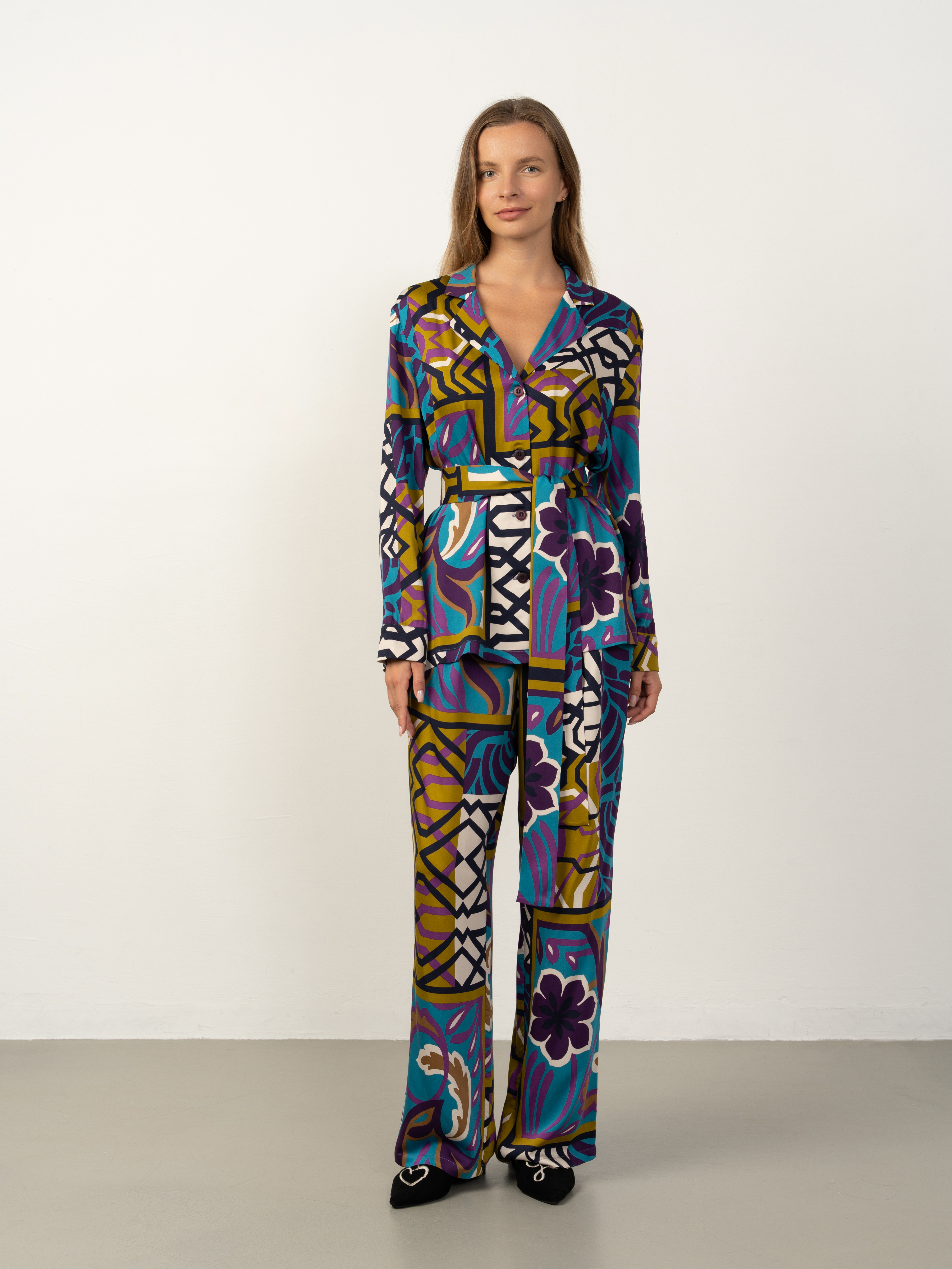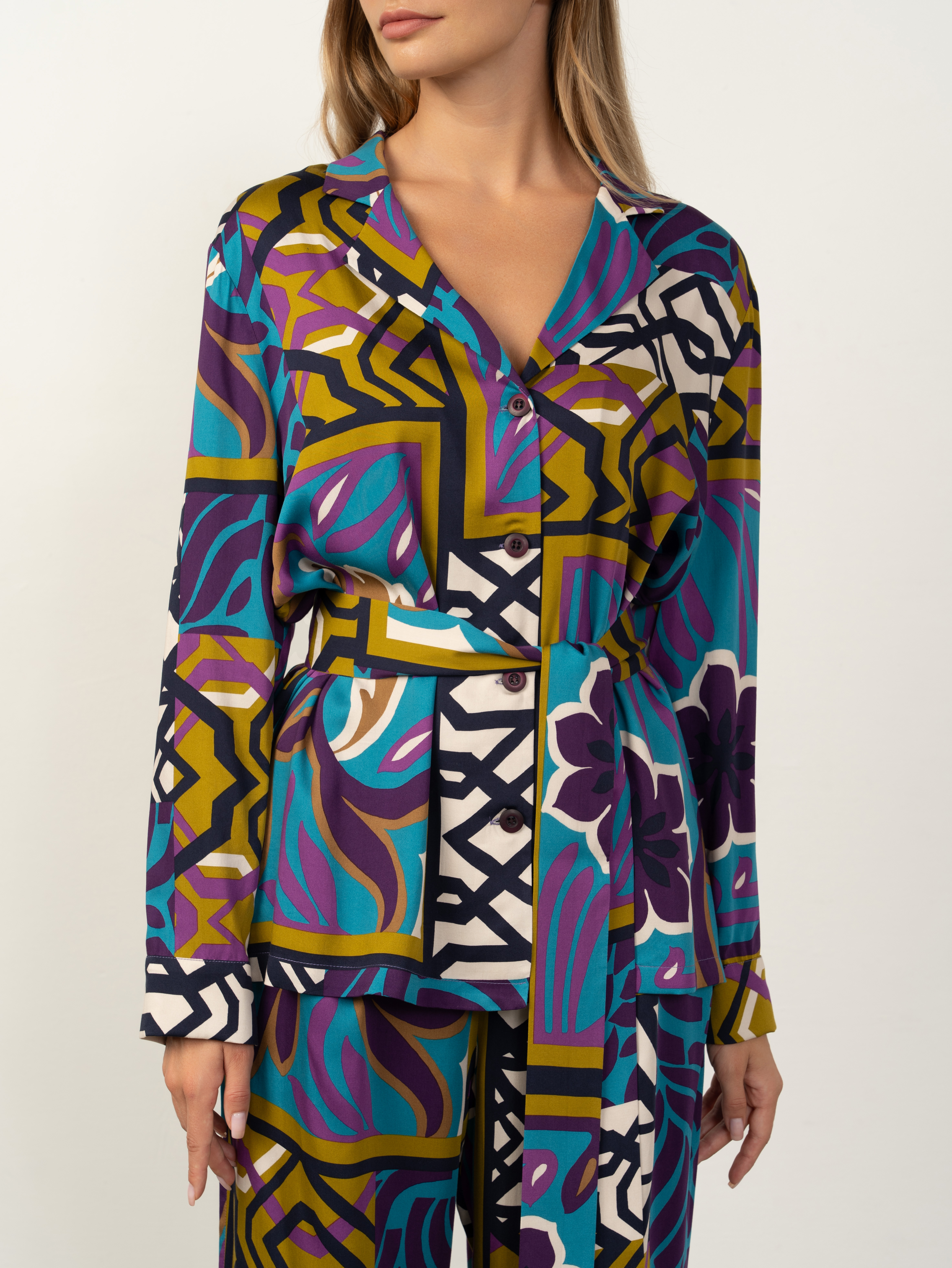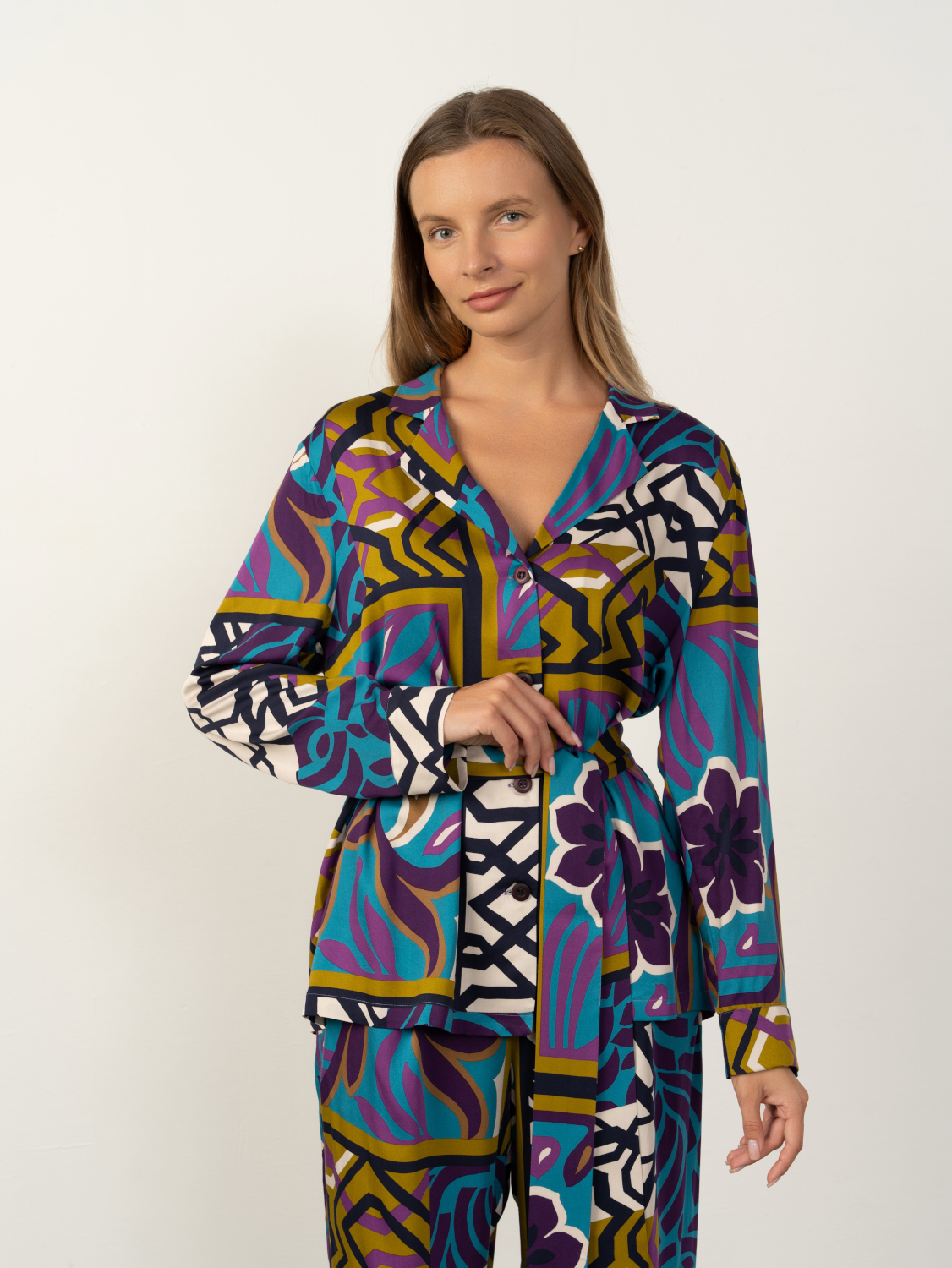 Комплект из вискозы с фиолетовыми акцентными цветами. Легкая, хорошо драпируется, не электризуется, дышит. Рубашка свободного кроя на пуговицах, брюки прямого кроя с поясом и комфортной резинкой со стороны спинки. Сделано в России