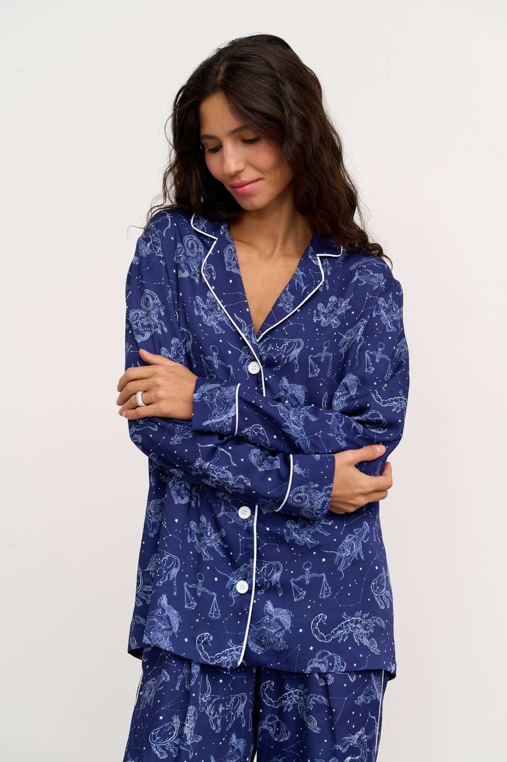 Комплект с принтом "знаки зодиака" выполнен из мягкой струящейся вискозы в синем оттенке. Отделка рубашки и брюк выполнена белым кантом. Комфортная резинка и защипы на брючках спереди подарят комфорт и свободу в движении. Сделано в России