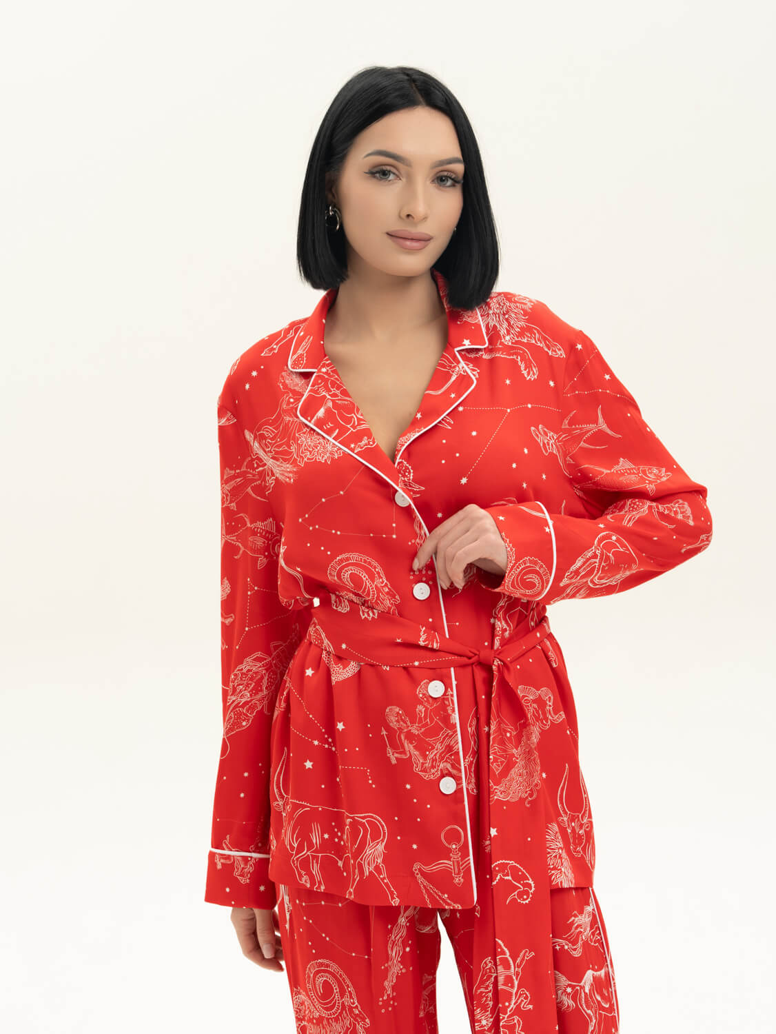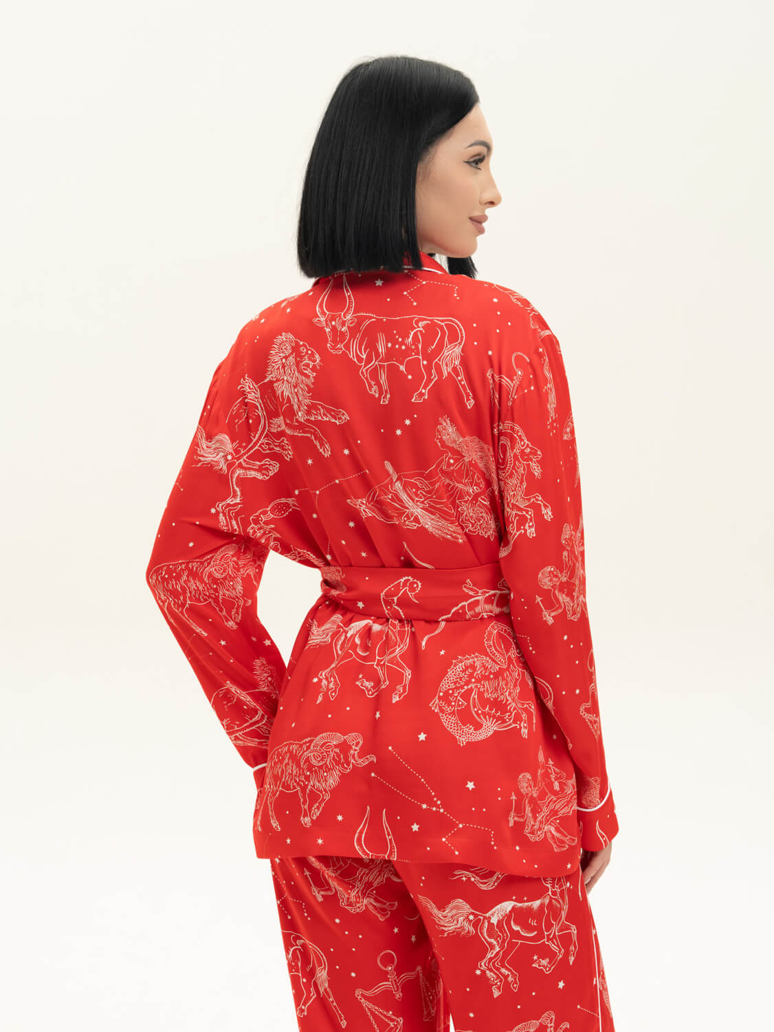 Комплект с принтом "знаки зодиака" выполнен из мягкой струящейся вискозы в красном оттенке. Отделка рубашки и брюк выполнена белым кантом. Комфортная резинка и защипы на брючках спереди подарят комфорт и свободу в движении. Сделано в России. Параметры модели: рост 170, 85-62-87