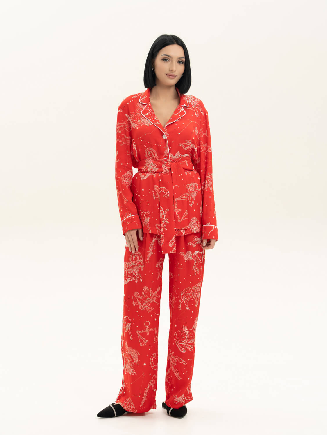 Комплект с принтом "знаки зодиака" выполнен из мягкой струящейся вискозы в красном оттенке. Отделка рубашки и брюк выполнена белым кантом. Комфортная резинка и защипы на брючках спереди подарят комфорт и свободу в движении. Сделано в России. Параметры модели: рост 170, 85-62-87