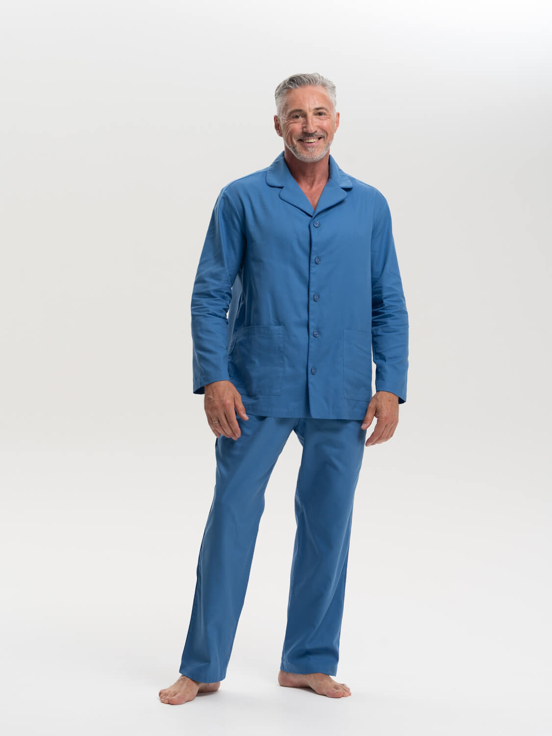 Пижама выполнена из хлопка и модала в синем цвете. Ткань мягкая, прочная и долговечная. Рубашка свободного кроя, с накладными карманами по бокам, брюки с карманами и эластичным поясом. Такой комплект выглядит стильно и элегантно, поэтому может стать хорошим подарком. Сделано в России.