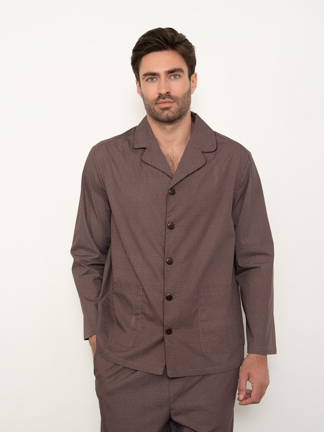 Пижама выполнена из рубашечного хлопка. Галстучный принт на бордовом фоне. Комплект состоит из свободных брюк прямого кроя и рубашки на пуговицах. Классический прямой крой и не сковывает движения. Свободную рубашку дополнили накладными карманами, а брюки с эластичным поясом. Такой комплект выглядит стильно и элегантно, поэтому может стать хорошим подарком близкому мужчине.
