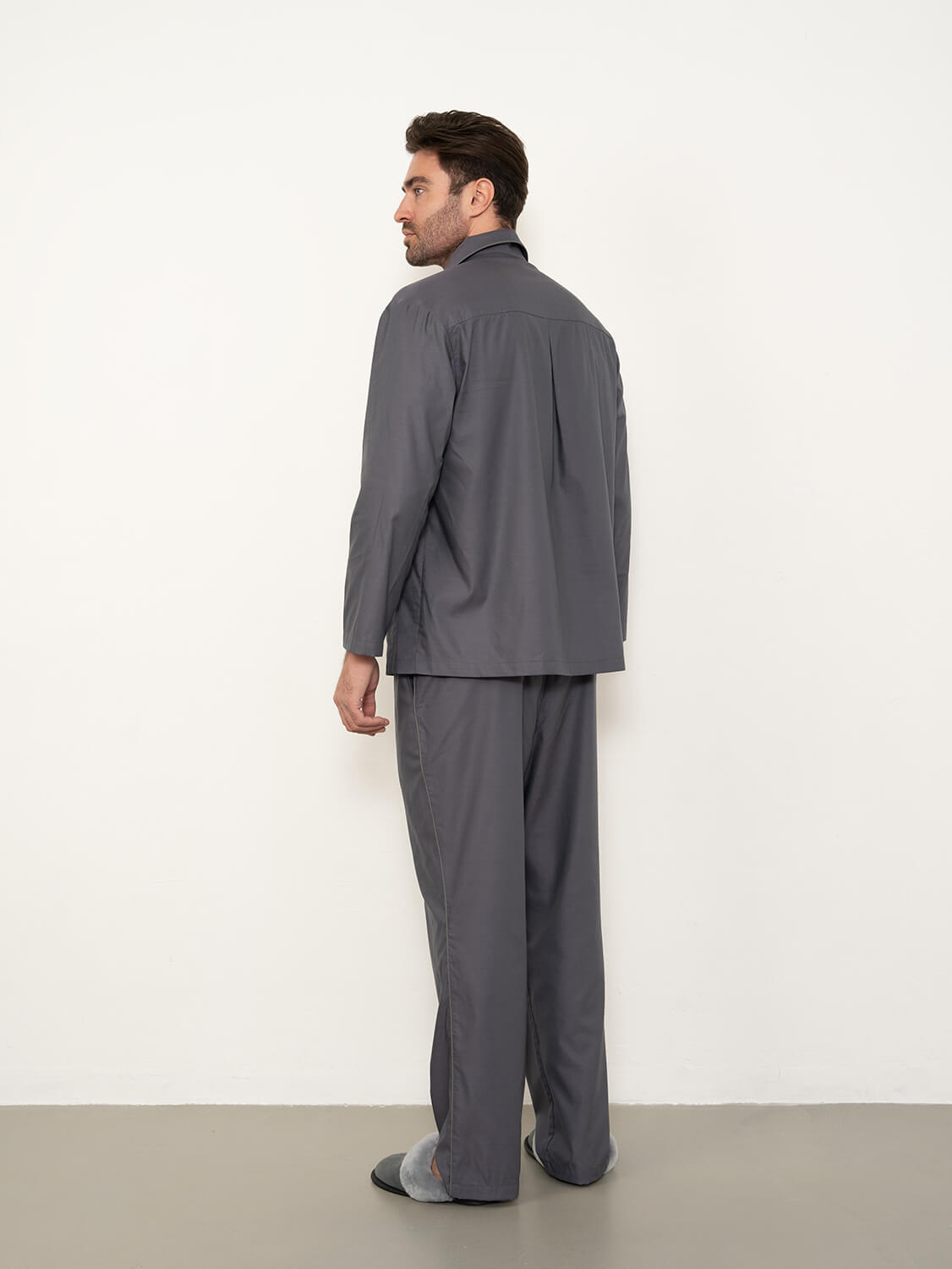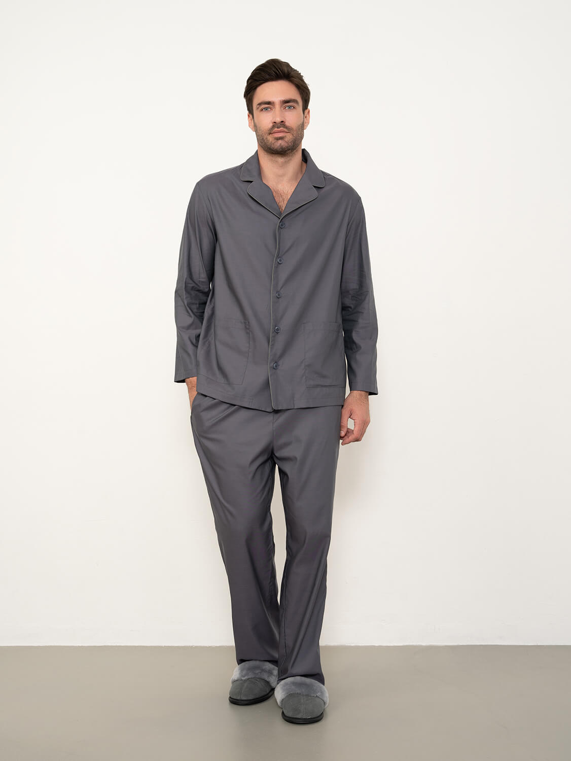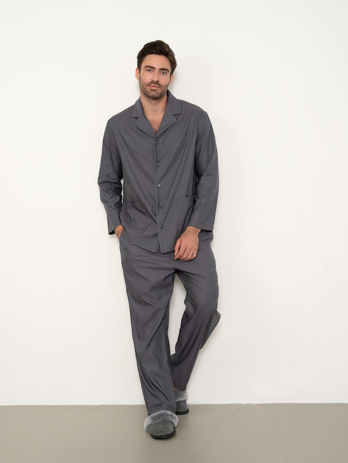 Пижама выполнена из хлопка и модала в сером цвете. Ткань мягкая, прочная и долговечная. Рубашка свободного кроя, с накладными карманами по бокам, брюки с карманами и эластичным поясом. Такой комплект выглядит стильно и элегантно, поэтому может стать хорошим подарком.
