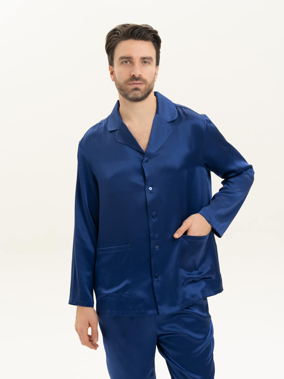 Пижамный комплект из премиальной коллекции Pijama Story Exclusive в насыщенном синем оттенке. Рубашка свободного кроя с пуговицами, брюки свободного кроя, спереди пояс, сзади резинка для комфорта движений не только дома, а так же и на отдыхе или вечеринке. Пижама выполнена полностью закрытыми швами с изнаночной стороны ювелирным люксовым шитьем .Шелк Mulberry - ценнейший вид шелка, сотканный из тончайших нитей тутового шелкопряда. Обладает прочным плетением и гипоаллергенными свойствами. ШЕЛК - это ткань, которая заявляет о себе. Он статусный, элегантный и роскошный, невероятно мягкий.