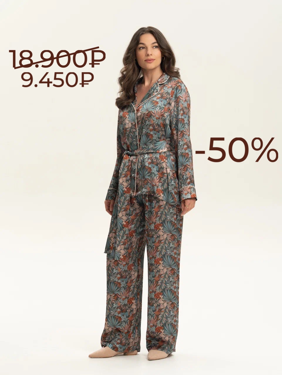 Костюм выполнен из невероятно мягкой атласной вискозы с авторским принтом, разработанным специально для Pijama Story. Ткань обладает деликатным глянцем и нежно струится по коже. Цветочные мотивы в принте создают романтичное настроение и подчеркивают женственность образа. Комплект состоит и рубашки свободного кроя , отделанной молочным кантом, брюк на эластичной резинке в талии и пояса, чтобы создать более женственный силуэт. Сделано в России. Параметры модели : рост 175, 88-60-90.