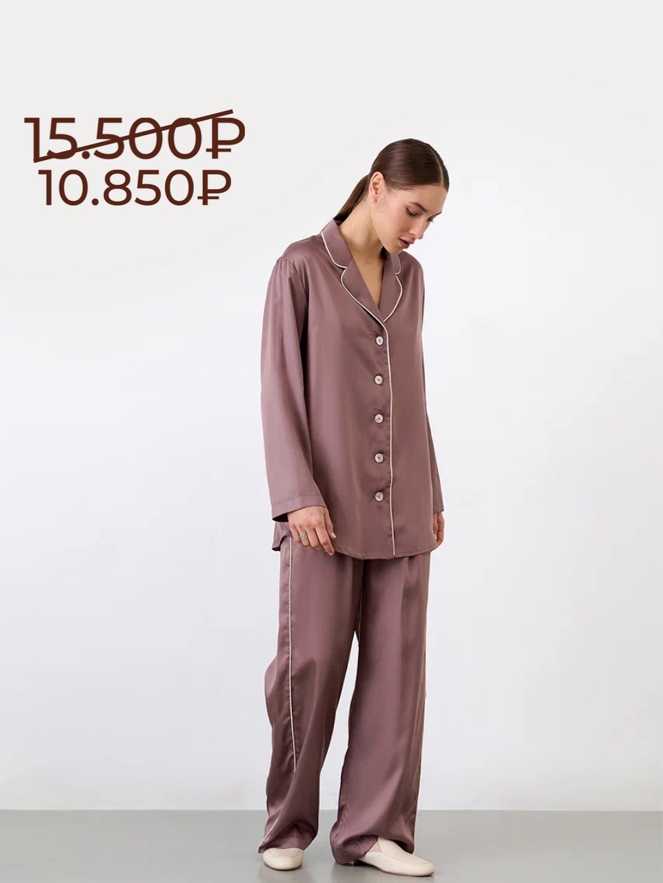 Комплект из 100% тенселя в оттенке какао. Ткань нового поколения, вырабатывается из эвкалиптового волокна. Приятная на ощупь, гладкая и мягкая. Ткань обладает комфортными тактильными свойствами, мягко струится, не пиллингуется и не линяет. Костюм состоит из удлиненной рубашки, брюк с эластичным поясом и карманами. Сделано в России