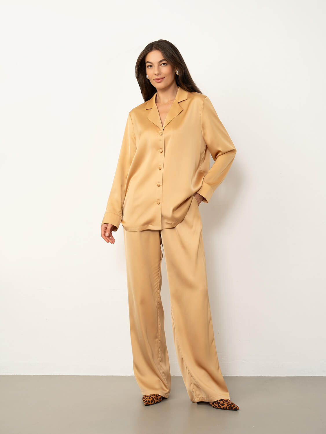 Пижама Gold diamond выполнена из струящегося смесового шелка. Ткань нежно скользит по коже и имеет деликатный глянец. Рубашка свободного кроя, пуговки обтянуты тканью. Изделие имеет полностью закрытые швы, что обеспечивает комфорт в носке и прочность. Для этого пижамного костюма мы использовали премиум пошив. Модель свободного кроя, при этом изысканная и женственная. Сделано в России