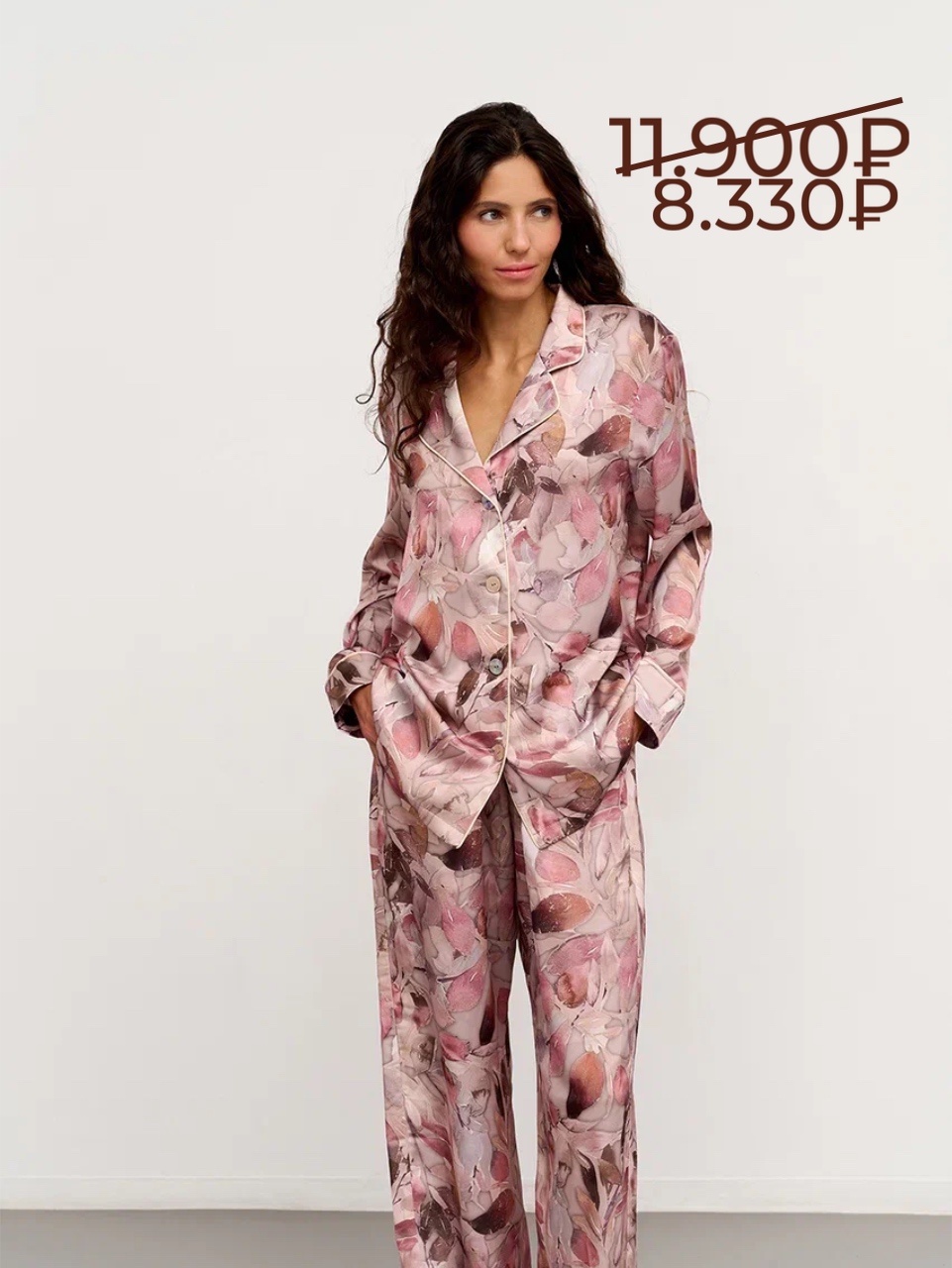 Пижама с цветочным принтом из сатинового шелка. Пижама свободного кроя. Рубашка с манжетами. Брюки с удобной резинкой в талии, с карманами. В комплекте пояс. Сделано в России