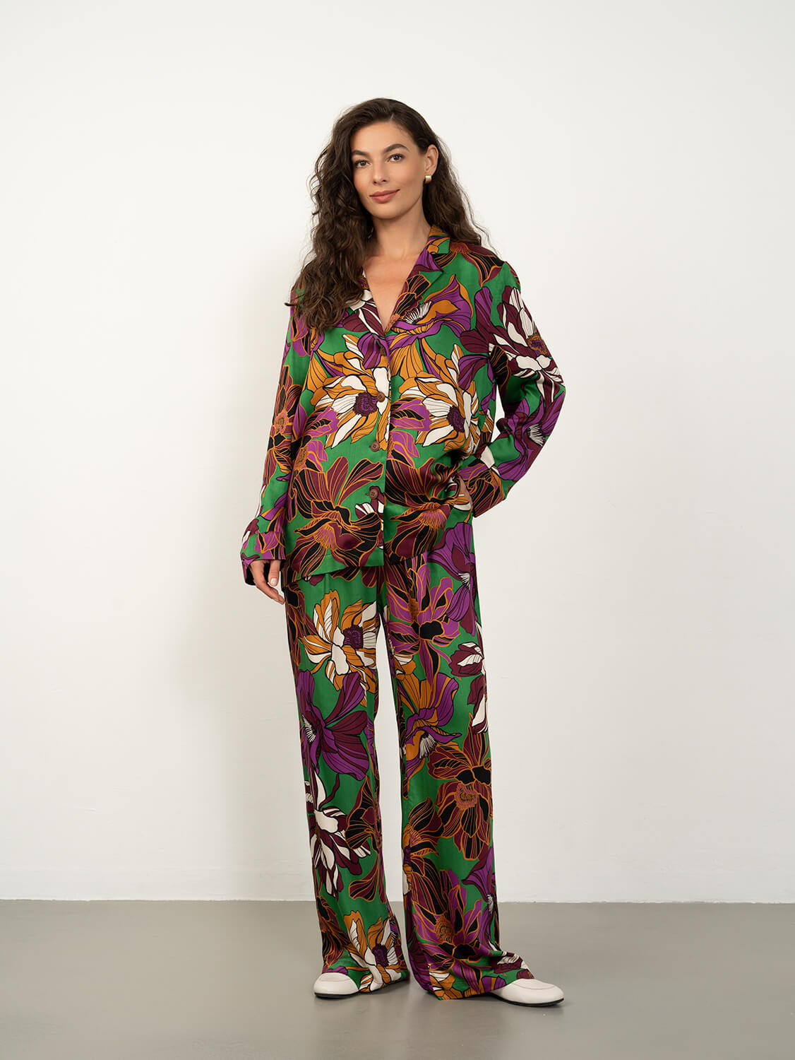 Пижамный костюм Simona выполнен из вискозы производства Италии. Цветовая гамма в сочетании с актуальными трендовыми оттенками - зеленый цвет яркой сочной травы и цветочно-растительный принт с фиолетовыми вставками вам подарит яркое настроение. Рубашка свободного кроя с отложенным воротником и пуговицами в цвет принта. Брюки классического кроя с защипами спереди под поясом и комфортной резинкой в талии со стороны спины, подарят полный комфорт в посадке. В таком пижамном костюме можно провести домашний вечер в кругу друзей или отправиться в путешествие, для прогулок по теплым улицам южных городов.