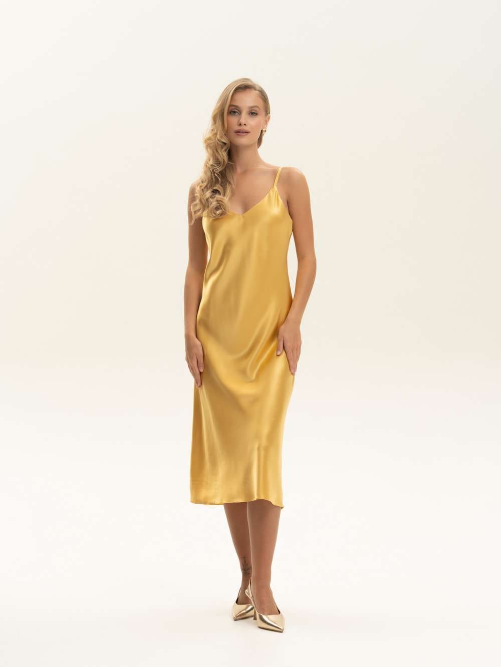 Классическое платье-комбинация в бельевом стиле длины миди в изысканном оттенке светлого золота из премиальной коллекции Pijama Story Exclusive. Присущие этой модели крой по косой, низкая спинка представляют собой современную роскошь соблазнительного минимализма. Платье выполнено полностью закрытыми швами с изнаночной стороны ювелирным люксовым шитьем. Натуральный шелк Mulberry обладает прочным плетением и гипоаллергенными свойствами, что делает изделие исключительно мягким и чувственным. Сделано в России. Параметры модели: рост 176 см, объем груди 85 см, талии 63 см, бедер 94 см. Доступно к заказу только при 100% оплате.