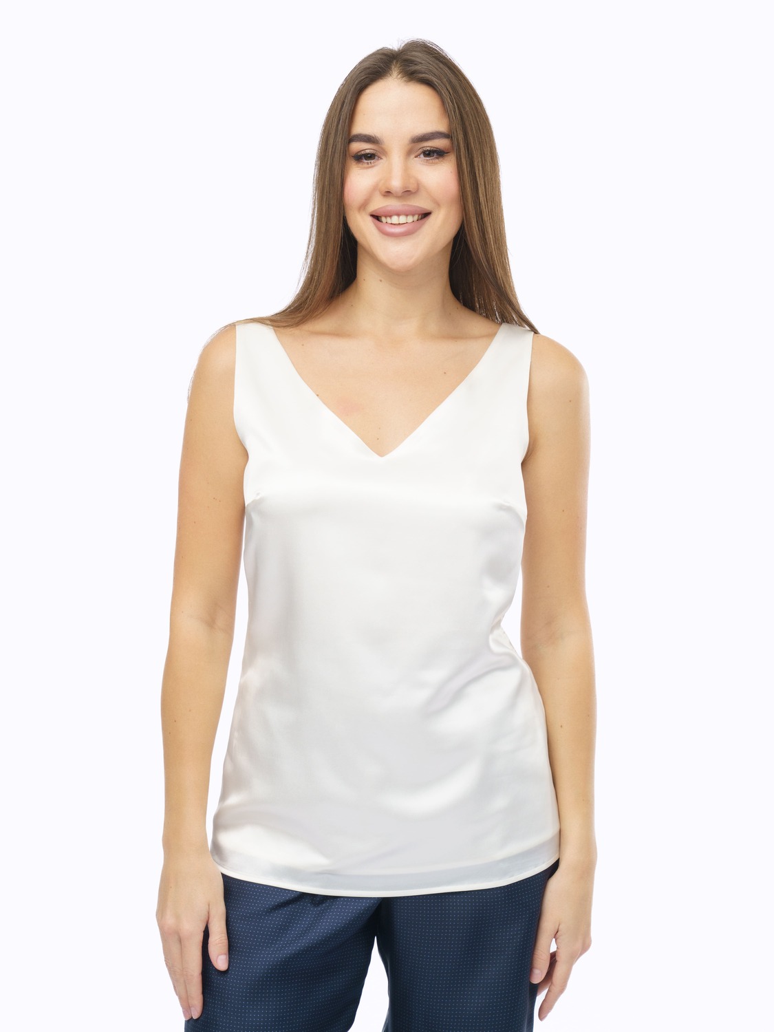 Элегантный топ станет идеальным дополнением к любому образу, подчеркивая Вашу индивидуальность и создавая ощущение комфорта и легкости. Шелковистая ткань придает изделию особый шарм и изысканность, делая его незаменимым элементом гардероба для особых случаев и повседневного стиля. Топ двуслойный, на широких бретелях с вытачками по спинке и на груди. Благодаря такому крою, изделие подчеркнет красоту и изящность женской фигуры.